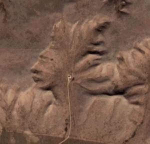 Badlands Guardian: Al sureste de Alberta, Canadá, existe una formación rocosa que vista desde el aire ofrece un parecido más que razonable a la cabeza de un ser humano con el tocado de un nativo americano. Encima es como si estuviera utilizando unos auriculares, aunque en realidad esto último no es sino el conducto de un pozo petrolífero. El descubrimiento fue posible gracias a Google Earth.