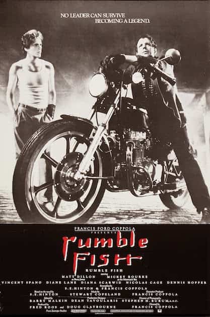 Luego pasa lo que pasa. Hace mucho vi una película en el marco de unas sesiones de cine-forum en la facultad (todo lo que allí pasaban era version original con subtítulos). Se titulaba Rumble fish (1983), con el entonces carismático Mickey Rourke encarnando al «chico de la moto» y unos jovencísimos Matt Dillon, Laurence Fishburne y Nicolas Cage. El film lo dirigía el maestro Coppola y me impactó el blanco y negro en que está rodado y la temática de rebeldías juveniles y desencantos asociados. Cuando largos años después quise saber más de esta película resultó complicado porque en español tenía por nombre La ley de la calle. Y yo con estos pelos.