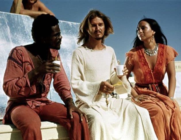 Carl Anderson (Judas), Ted Neeley (Jesucristo) e Yvonne Elliman (María Magdalena) durante el rodaje de la película.