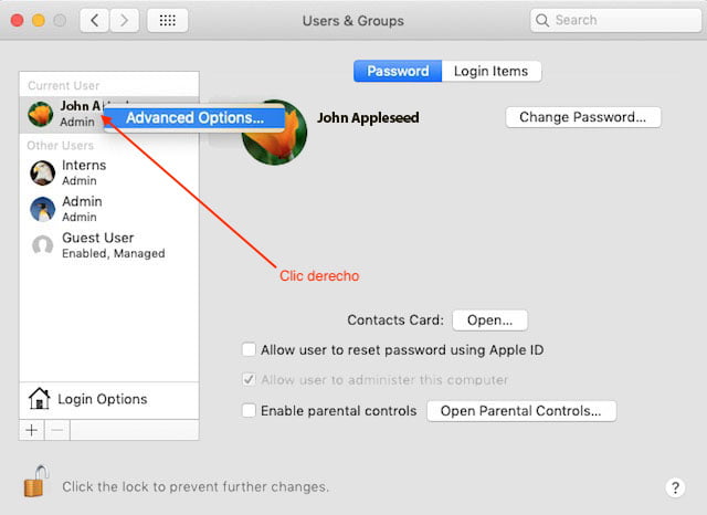 1. A continuación ir a Preferencias del sistema > Usuarios y grupos. Desbloquea el candado.