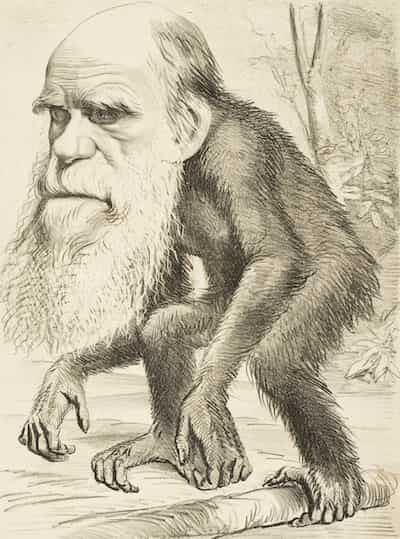 Caricatura británica de la década de 1870 representando a Darwin con cuerpo de simio.