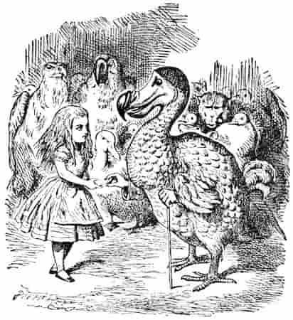 Las pocas fuentes que hay del Dodo son unas ilustraciones, unos pocos restos óseos… y relatos de ficción. En Alicia en el país de las maravillas Lewis Carroll personifica al animal como un ser absurdo e irreal que organiza una carrera de los animales caídos en el charco de lágrimas.
