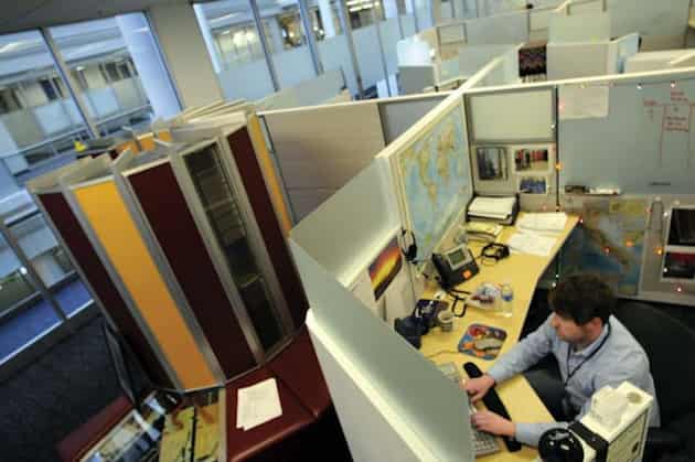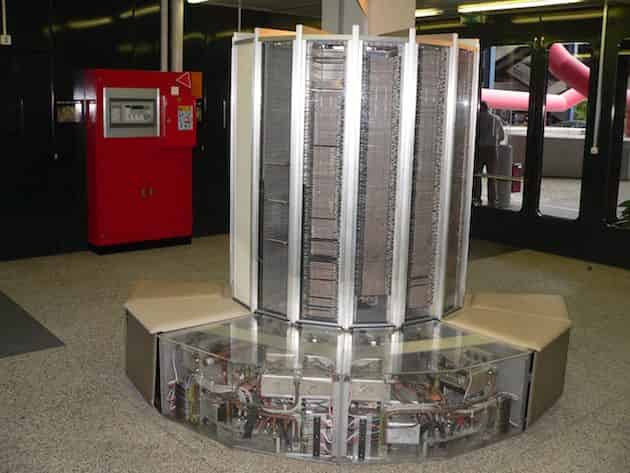 Un ingeniero de software trabajando en su cubículo al lado de la Supercomputadora Cray 1, un dinosaurio de los primeros tiempos de la informática.