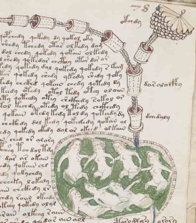 Biológica. Un texto denso y continuo con figuras de pequeñas mujeres desnudas tomando baños en balnearios públicos o tinas interconectadas por una elaborada red de tuberías, algunas de ellas claramente en forma de órganos del cuerpo. Hay mujeres que llevan coronas, posiblemente sean ninfas.