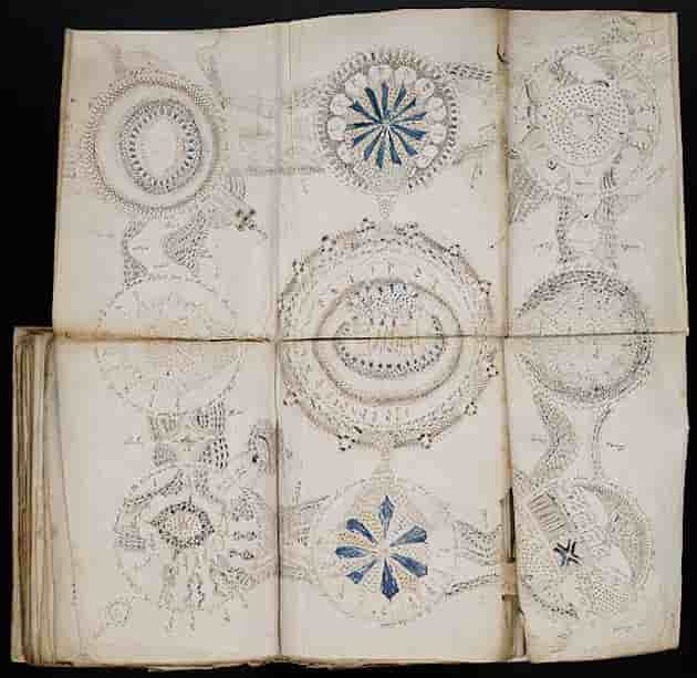 Hay por otro lado dibujos semejantes a células vistas a través del microscopio, lo que implicaría un origen mucho más moderno (nos iríamos al siglo XVII).