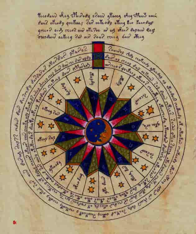 Astronómica. Contiene diagramas circulares (soles, lunas, estrellas), lo que sugiere que trata de astronomía o astrología. Cada símbolo está rodeado por exactamente 30 figuras de mujeres en miniatura, la mayoría de ellas desnudas, cada una sosteniendo una estrella.