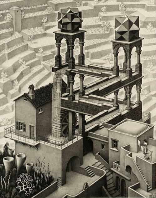 La casa de piedra italiana fue el referente estructural de las construcciones que pintó. También estuvo en nuestro paí­s y en la observación de la Alhambra y la mezquita de Córdoba es donde dicen que algo se debió de remover en su interior. La recargada ornamentación musulmana con sus detalles enrevesados pero al mismo tiempo precisos le encandilaron, marcándole una dirección, si bien los motivos islámicos sólo son de tipo geométrico (por prohibición coránica) y Escher compuso con todo tipo de figuras.