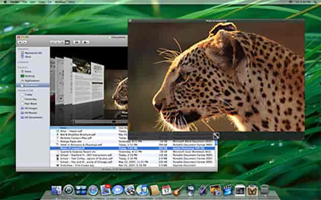 - Finder. Con nueva barra lateral estilo iTunes, CoverFlow para una localización visual de archivos y un nostálgico y útil rescate: reaparece la opción de compartir carpetas (se recupera algo que existía con los sistemas Classic).