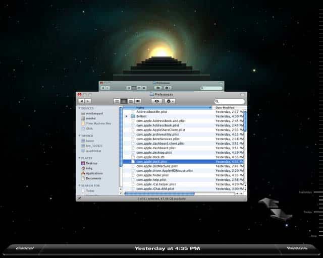 - Nueva hornada de Aplicaciones: Time Machine, QuickLook y Spaces principalmente. Time Machine ofrece la posibilidad de copias de seguridad cada hora y poder restaurar un sistema completo. Dicen que Time Machine se come los discos duros de destino que da gusto por su forma de trabajar haciendo copias cada hora. Pero es una aplicación muy útil, potente y tremendamente sencilla que traerá vientos de cambio a los sistemas de backup domésticos. QuickLook es una gozada, y Vista previa lo muestra casi todo instantáneamente pulsando la barra espaciadora (fotos, vídeos, música, documentos).