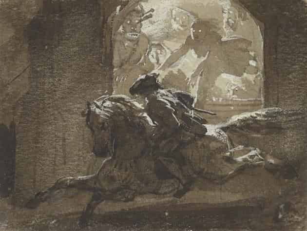 En ese momento estalló un relámpago seguido de la más tenebrosa oscuridad. Aterrorizado, Tam espoleó a su yegua y echó a correr como alma que lleva el diablo seguido de cerca por la joven y bella bruja. Por un milagro recordó que las brujas no pueden atravesar las corrientes de agua y se dirigió al puente más cercano pero cuando estaba a punto de llegar, la bruja alargó el brazo, agarró la cola de la yegua y se la arrancó de cuajo.