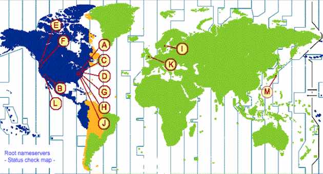 Hay 13 grandes servidores o Root Servers cuya distribución geográfica responde al origen estadounidense de todo esto: 10 en Estados Unidos (6 en los alrededores de Washington, 4 en California) , 1 en Estocolmo, 1 en Londres y 1 en Japón, nombrados con las 13 primeras letras del alfabeto (de la A a la M). Se hallan en manos de 9 organismos y corporaciones diferentes: universidades, empresas privadas y organismos relacionados con el ejercito de EEUU.
