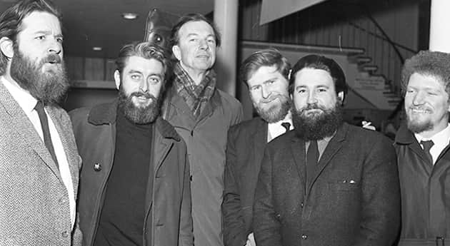 The Dubliners en 1966. De izquierda a derecha: Ciaran Bourke, Ronnie Drew, Pete Seeger, John Sheahan, Barney McKenna y Luke Kelly