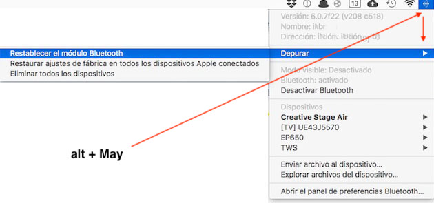 5. ¿Se sigue resistiendo? Entonces es hora de utilizar el menú oculto de depuración de Bluetooth. Esto intentará depurar cualquier problema a nivel más profundo. Con mayúsculas + ALT pulsadas, despliega el símbolo Bluetooth de la barra de menús y: