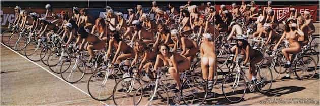 La jugada de Queen consistía en matar dos pájaros de un tiro publicitando con fuerza y simultáneamente las dos. Para ello el grupo contrató a 65 mujeres para que montaran en bicicleta alrededor del estadio de Wimbledon, eso sí, desnudas. Ignoro si fueron los primeros en cavilar algo así, en cualquier caso diría que fue una suprema ocurrencia.