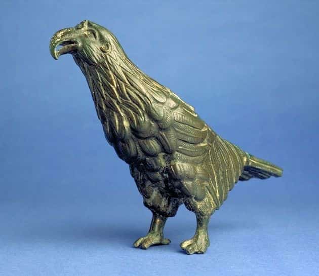 Humildemente, he de discrepar; la forma del ave y la ausencia de alas no coinciden con la apariencia de las Aquilas legionarias, con lo que puede tratarse simplemente de una estatuilla votiva de bronce de las usadas entonces para realizar ofrendas.