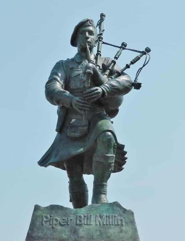 Vestido con su kilt, la típica falda escocesa (el único hombre entre los 165.000 que desembarcaron aquel día que iba ataviado así) y sin más armas que el cuchillo ceremonial escocés y su gaita, Millin tocó y tocó …